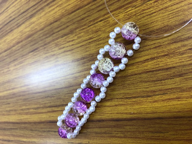 今週火曜日の午後にはビーズアクセサリー・ブレスレットを製作しました。今回は、ただ通していくだけではなく、大きいビーズのところでは八の字に通したりしました。言葉で言うより見てもらった方が早いでしょうかね。というわけで、こうなりました!素敵ですよね。あともう少しやらないと終わらないのですが、それも楽しみですね。